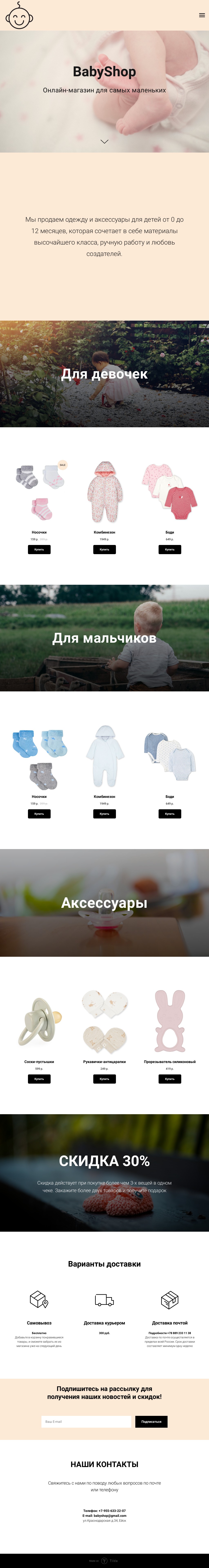 Минималистичный Landing Page для начинающего онлайн-магазина BabyShop. Приятный дизайн, исполненный в нежных тонах.