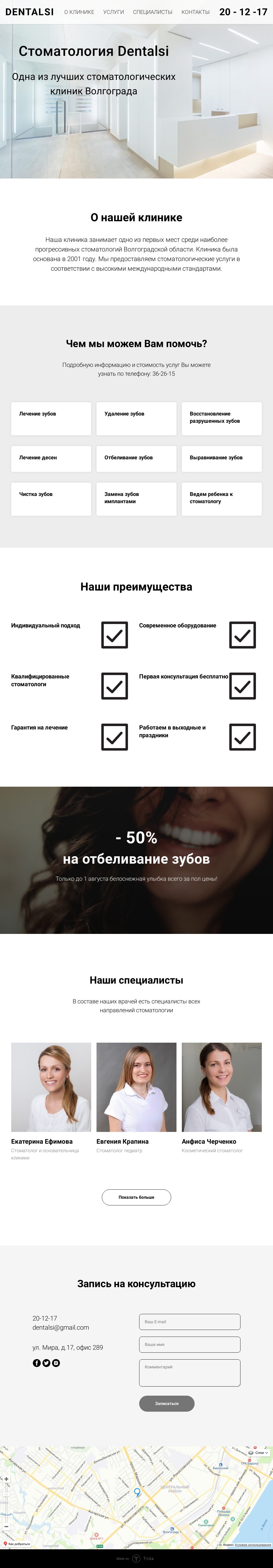 Изумительный Landing Page для современной стоматологической клиники. Дизайн, выполненный в европейском стиле. Используются светлые тона, распологающие клиента.